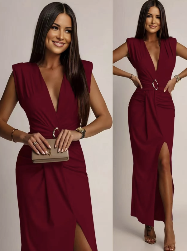 Robe chic, fendue, col en V avec son anneau qui marque la taille